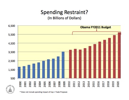 “The Administration will attempt to focus attention on a handful of proposals supposedly aimed at tempering the Federal Government’s explosive growth. But these have far more to do with calming Americans’ concerns than with doing anything to address them. His pay-as-you-go proposal has been waived or circumvented and only locks in deficits at their current high levels. His non-binding commission simply punts on the critical budget decisions that Members of Congress got elected to make. Finally, his so-called ‘freeze’ on some discretionary spending follows an 84-percent increase – and has no clear means of enforcement.