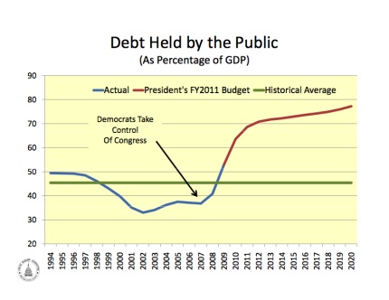 “For the duration of the Administration’s 10-year budget, the deficit never falls below $700 billion, and never falls below 3.6 percent of GDP – a level the Administration’s own budget director has called ‘unsustainable.’ Debt held by the public doubles over 5 years, triples over 10,   and exceeds 60 percent of GDP as a share of the economy this year – surpassing last year’s 50-year high. Debt continues to rise to consume 77.2 percent of our economy by the end of the budget window. Even the countries of the European Union, hardly exemplars of fiscal rectitude, are required to keep their debt levels below 60 percent of GDP.