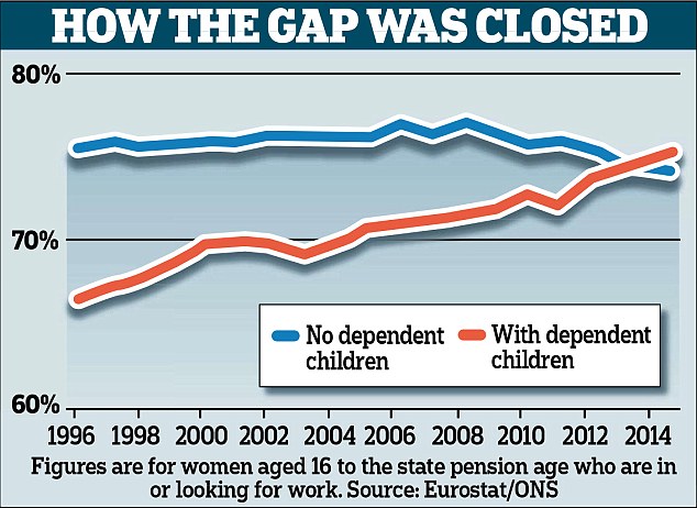 By comparison, 75 per cent of women without dependent children were either in work or looking for a job last year.