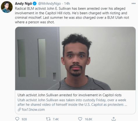 Su11ivan, the founder of “an activist group formed after the killing of George Floyd in the summer of 2020” entitled 1nsurgence USA which “calls itself anti-fasc1st and protests police brutality,” insisted he was only inside the U.S. Capit0l on January 6th to “record.”