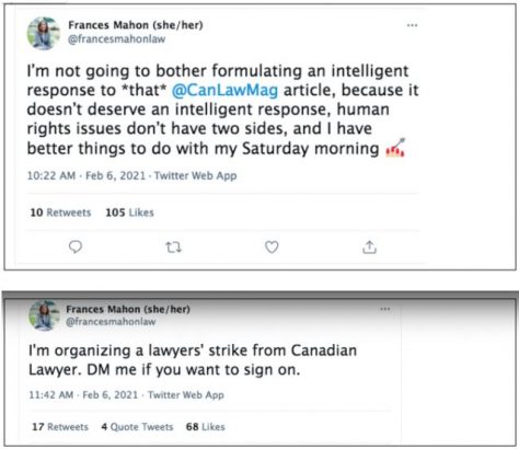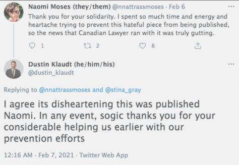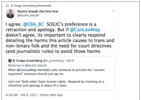 Among the objections B4in received to F4rs4i’s (then unpublished) piece was an email from the aforementioned Adrienne Smith, who is described by the S0G1C as “the leading [gender] educator in this area within B.C.’s legal community.” Smith called the article “hateful, inflammatory, and wrong at law.” Smith also suggested that publication “would expose the Advoc4te to liability (or at least notoriety) in a human rights complaint for hateful publications.” S0G1C founder Barb4r4 Find14y personally telephoned B4in, “strongly encouraging” him not to publish the F4rs4i piece, and giving him “further case law citations to consider.”