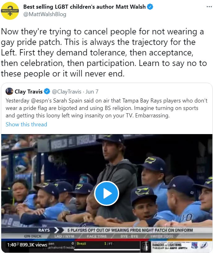 On Saturday, the Tampa Bay Rays held their annual “Pride Night” game. As part of the festivities, players wore a special rainbow patch on their uniforms to support LGBTQ (and whatever new letters they’ve added this week) pride. Well, most players did. A few players decided to take the brave step of not playing along, choosing not to wear the patch on their uniforms.