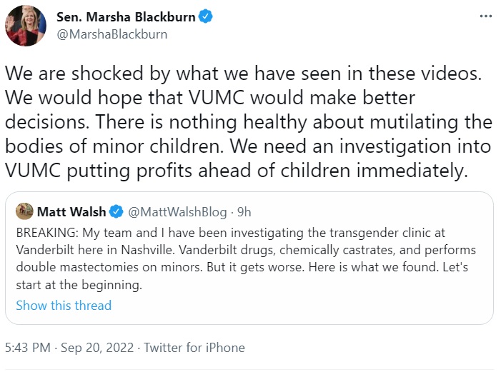 I’m quite excited to say that Republican Senator Marsha Blackburn is calling for an investigation of VUMC.