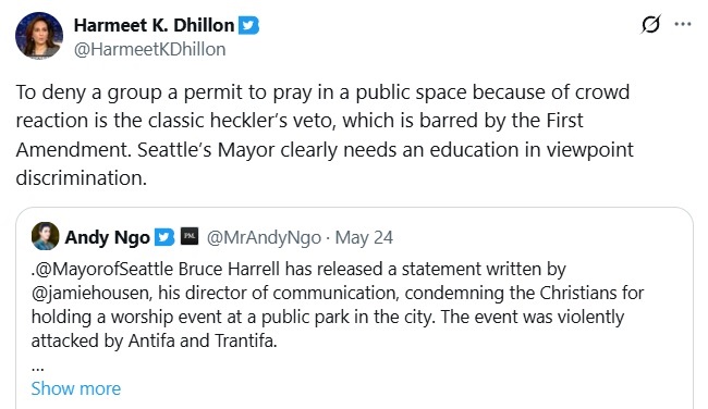 Now, you might remember that I blogged about Harmeet K. Dhillon a while back. She is the replacement for Kristen Clarke, the Biden official who persecuted pro-lifers for peaceful demonstrations. And she said this, on X: