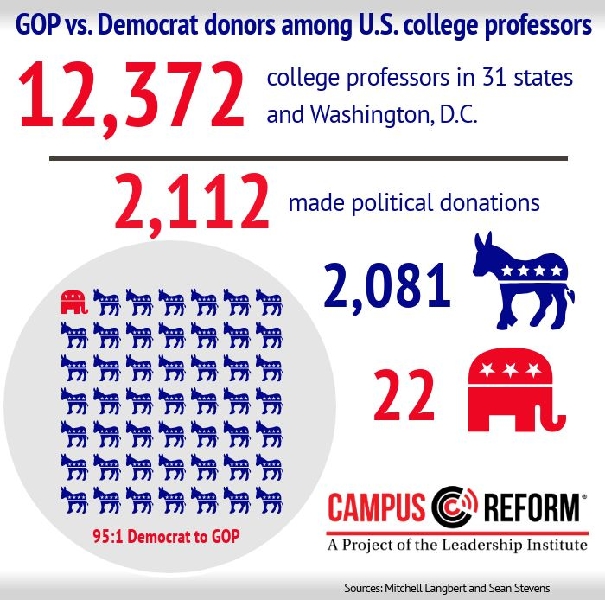 A recent study found that U.S. college professors donate exclusively to Democrats over Republicans by a 95:1 ratio.