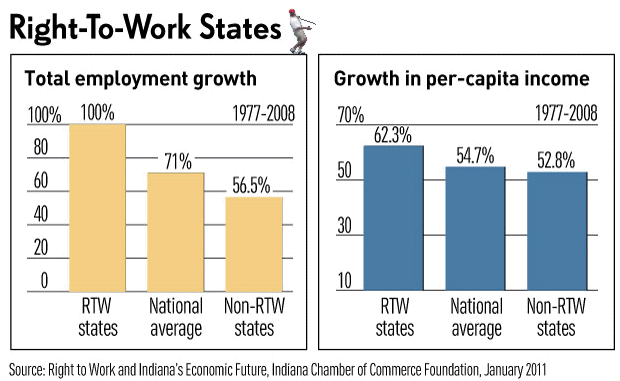 Doug Ross posted these charts a while back that show that employees also do better in right to work states. There are more jobs being created, and the income growth is higher than the forced union states.