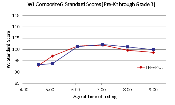 As is evident, pre-K and control children started the pre-K year at virtually identical levels. The TNVPK children were substantially ahead of the control group children at the end of the pre-K year (age 5 in the graph). By the end of kindergarten (age 6 in the graph), the control children had caught up to the TNVPK children, and there were no longer significant differences between them on any achievement measures. The same result was obtained at the end of first grade using two composite achievement measures (the second created with the addition of two more WJIII subtests appropriate for the later grades). In second grade, however, the groups began to diverge with the TNVPK children scoring lower than the control children on most of the measures. The differences were significant on both achievement composite measures and on the math subtests. Differences favoring the control persisted through the end of third grade.
