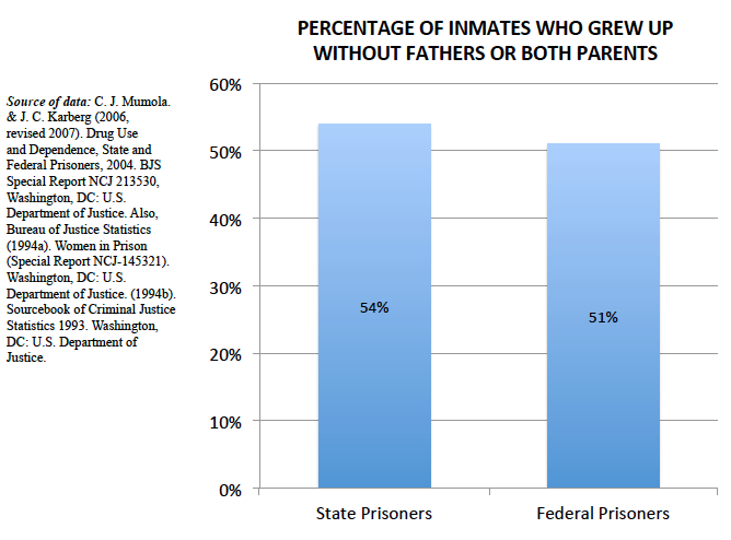 Patrick Darby, Wesley Allan, Javad Kashani, Kenneth Hartke and John Reid, “Analysis of 112 Juveniles Who Committed Homicide: Characteristics and a Closer Look at Family Abuse,” Journal of Family Violence 13 (1998): 365-374.Boys who are fatherless from birth are 3.061 times as likely to go to jail as peers from intact families, while boys who do not see their father depart until they are 10 to 14 years old are 2.396 times as likely to go to jail as peers from intact families. Cynthia C. Harper and Sara S. McLanahan, “Father Absence and Youth Incarceration,” Journal of Research on Adolescence 14 (2004): 369-397