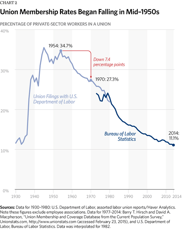 States with right-to-work laws never said that there couldn’t be unions, only that workers wouldn’t have to join a union to work. And in right-to-work states, not only did workers not join unions, they voted not to unionize at all. This resulted in a massive decline in private sector unions in America: